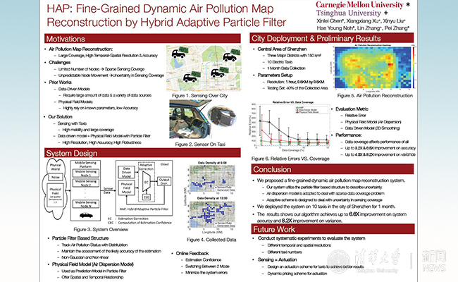 荣获最佳海报提名奖(best poster runner-up award)的论文《HAP -混合自适应粒子滤波器实现动态高精度空气污染信息场重建》“HAP- Fine-Grained Dynamic Air Pollution Map Reconstruction by Hybrid Adaptive Particle Filter”作者分别为:陈鑫磊(卡耐基梅隆大学)、徐祥祥(清华大学电子工程系)、刘新宇(清华大学电子工程系)、卢海永(Hae Young Noh,卡耐基梅隆大学)、张林副教授(清华大学电子工程系、清华-伯克利深圳学院),张旆副教授(卡耐基梅隆大学)。论文研究解决重建城市范围高时间和空间分辨率的动态空气污染信息场问题。提出通过将自主设计的低成本空气检测系统安装在出租车上,实时采集城市空气污染数据。基于传统的粒子滤波理论,本研究设计了一套混合自适应结构,融合了数据模型和物理模型的优势,实现了在数据稀疏且传感覆盖不确定的情况下,高精度实时恢复空气污染信息场。