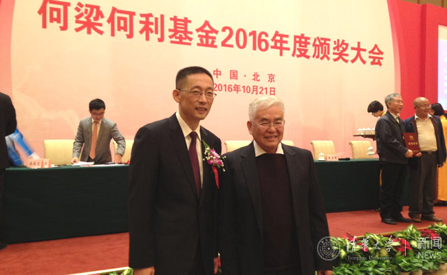 清华大学生命科学学院施一公院士荣获何梁何利科学与技术成就奖,并代表获奖人作简短演讲。清华化学系张希院士和计算机系郑纬民教授荣获何梁何利科学与技术进步奖。