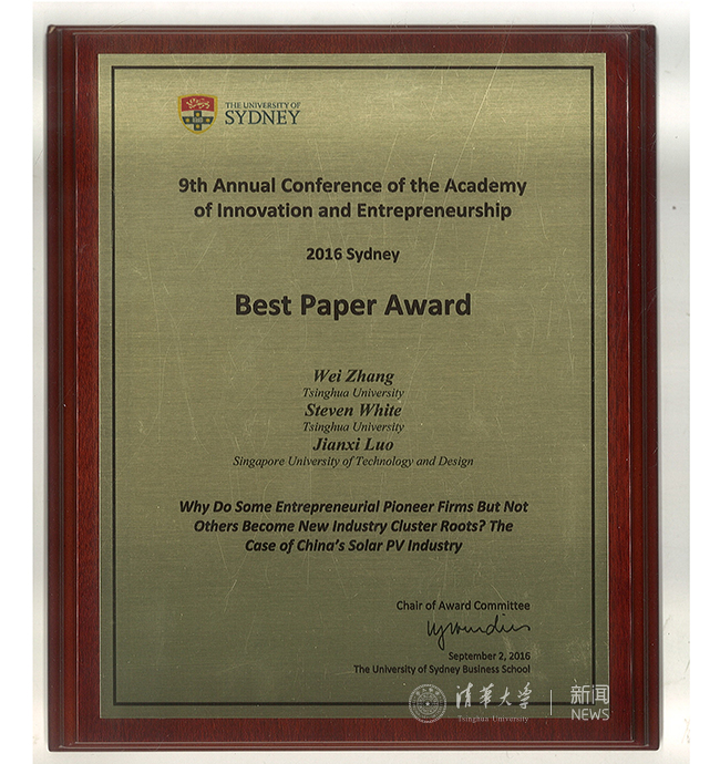 清华新闻网9月19日电 (通讯员 张瑾琳)9月,清华经管学院创新创业与战略系张帏教授、白思迪(Steven White)教授与新加坡科技设计大学罗建曦教授合著的会议论文《为什么某个创业企业而不是其它企业能成为产业集群的根基企业?——基于中国光伏产业的研究》(Why do some entrepreneurial pioneer firms but not others become industry cluster roots? The case of China's solar PV industry)在第九届创新创业国际学术年会(9th Annual Conference of the Academy of Innovation and Entrepreneurship,简称AIE年会)获得唯一的最佳论文奖(Best Paper Award),这是清华大学教师首次在AIE年会上获此殊荣。