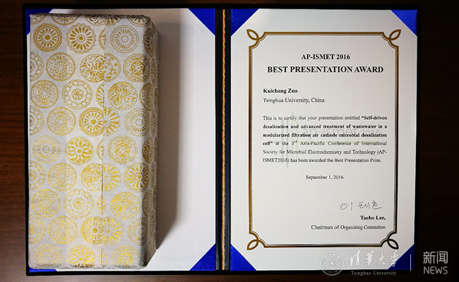清华新闻网9月7日电 8月31日至9月2日,第三届亚太地区国际生物电化学会议(The 3rd Asian-Pacific Conference of the International Society for Microbial Electrochemistry and Technologies)在韩国釜山举行。由清华大学环境学院教授黄霞指导的博士生左魁昌题为《模块化过滤型阴极微生物脱盐电池用于污水深度处理及脱盐》的报告获得了会议的“最佳报告奖”,是本次会议3位获奖者之一。