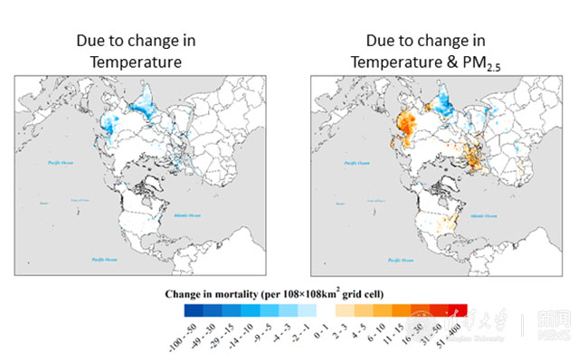 颗粒物的辐射效应导致早逝人数的变化:仅考虑温度的响应(左图),综合考虑温度和PM2.5浓度的响应(右图)。