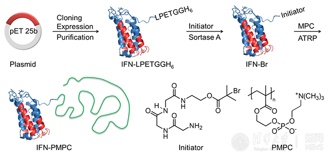 清华新闻网7月12日电 日前,清华大学医学院生物医学工程系高卫平实验室在药剂学国际顶级期刊《控制释放期刊》(Journal of Controlled Release)上在线发表了题为《C端定点原位生长肿瘤治疗功效优于派罗欣的干扰素-磷脂类高分子偶联物》(In situ growth of a C-terminal interferon-alpha conjugate of a phospholipid polymer that outperforms PEGASYS in cancer therapy)的学术论文,在国际上首次报道定点原位生长(site-specific in situ growth, SIG)干扰素-磷脂类高分子偶联物(IFN-PMPC)。动物水平研究表明,该新型干扰素-磷脂类高分子偶联物比罗氏公司商品化药物派罗欣(PEGASYS)展现出更好的肿瘤治疗效果。高卫平研究员为本文的通讯作者,其博士生胡瑾为第一作者。