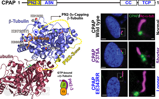 图一 中心粒蛋白CPAP的PN2-3结构域与微管素二体的复合物结构及其突变体对纤毛长度的影响。
