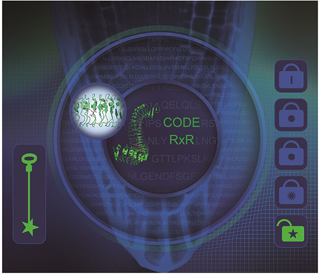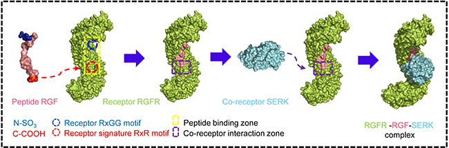 最近,清华大学柴继杰研究组通过结构生物学研究,发现了一个普遍存在于植物小肽类激素受体识别的规律:小肽激素的C末端游离的羧基(-COOH)会特异被植物小肽激素受体上的“精氨酸-精氨酸”(RxR)模式序列所识别。通过这一规律,将RGF受体候选对象锁定在含有此模式的一类受体激酶当中。研究组巧妙设计了“分之筛-质谱”新实验方法,于体外成功鉴定出“RGF 配体-受体对”(RGF-RGFR pair),随后获得了RGF-RGFR复合物的2.6A晶体结构。与猜想完全吻合,复合物结构清晰地显示RGF的C末端游离羧基(-COOH)特异地结合在了受体RGFR的(RxR)小肽激素模式识别序列上。同时,研究还惊喜地发现,在RGF的受体上“精氨酸-甘氨酸-甘氨酸”序列(RxGG)特异地识别了小肽激素RGF上的磺酸化修饰。通过受体序列比对,发现一个由五个成员组成的受体激酶亚家族特异地含有此(RxGG)磺酸化模式识别序列,研究组最终找出了RGF的全部五个受体。此外,RGF-RGFR的复合物结构还提示RGF信号通路的起始还需要其他成分参与,通过体外生化实验表明SERK家族成员可能作为共受体参与RGF受体激活。