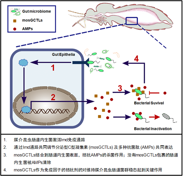在该项研究中,程功课题组利用RNA干扰在埃及伊蚊及致倦库蚊体内筛选鉴定出多种C型凝集素蛋白,该类蛋白可有效促进蚊媒肠道内生菌在肠道内的存活与定植。课题组对C型凝集素促进蚊媒肠道内生菌定植的作用机制进行了深入研究,发现肠道内生菌可通过激活Imd免疫通路,同时诱导抗菌肽和C型凝集素的高表达,C型凝集素通过阻滞抗菌肽与肠道菌的结合,而使肠道菌躲避了抗菌肽对其杀伤,从而在蚊子肠道中稳定存活。