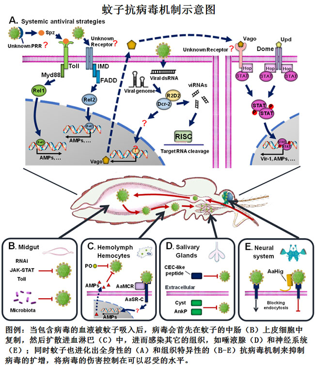 蚊媒病毒性传染病是一类由蚊子携带并传播给人类的烈性传染病。由蚊媒传播的人类病毒有数百种之多,近年来,多个新发及再发蚊媒病毒传染病已对人类的健康产生极大的威胁。作为蚊媒传染病的天然媒介,蚊子对蚊媒病毒高度易感。病毒进入蚊子体内后可在蚊子的组织中快速扩增并维持很高的病毒滴度。但是,病毒的感染复制对蚊子的组织没有造成明显的生理或病理损伤,病毒感染也不会影响蚊子的行为和生存寿命,说明蚊子已经进化出了特有的抗病毒机制耐受病毒的持续性感染。在该综述中,程功研究员对蚊子的抗病毒免疫系统进行分类综述,提出除系统性抗病毒反应以外,多种组织特异性抗病毒反应是蚊虫限制病毒感染的关键免疫机制。同时,该综述总结提出了该领域需要回答重要科学问题,对未来的媒介昆虫抗病毒研究进行展望。