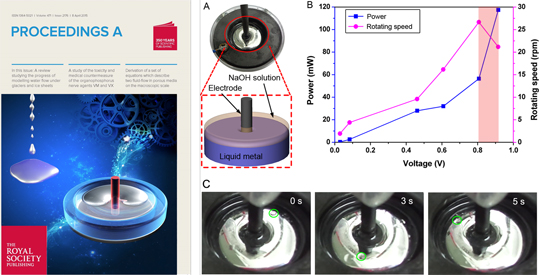 在发表于《Proceedings of the Royal Society A(英国皇家学会会刊A)》的题为“溶液内液态金属球形或池形物体的电磁旋转运动”(Electromagnetic rotation of liquid metal sphere or pool object inside solution, 2015-04-8)论文中,作者们发现,耦合外加磁场和电场可实现溶液中单颗金属液滴的离心旋转操控,相应研究被选为期刊封面故事(图3)。这种液态金属电动机在发展柔性旋转机器、光电芯片冷却、液态金属泵、材料配制设备等方面有重要用途。文章第一作者为理化所博士后王磊,通讯作者为刘静教授。