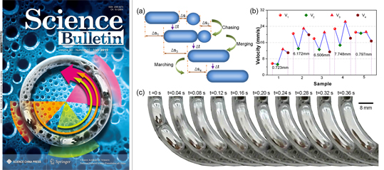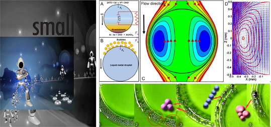 在《Small(微小)》上在线发表的题为“基于自驱动液态金属马达群碰撞与融合行为的过渡态机器”(Transient state machine enabled from the colliding and coalescence of a swarm of autonomously running liquid metal motors, 2015-08-17)论文中,研究小组首次定义并证实了一种崭新的机器形态-过渡态机器,论文被选为期刊内封面故事。文章第一作者为医学院博士后盛磊,通讯作者为刘静教授。