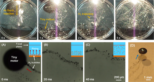 图4 铝质驱动液态金属马达产生的氢气流轨迹与驱动颗粒运动情形。