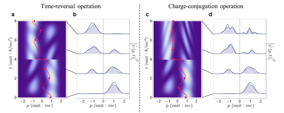 图2:动量空间中的Majorana动力学演化过程中的时间反演和电荷共轭。该粒子的时间演化是由Majorana方程决定的,对称操作发生在演化的中点t=4。 a,b. 在时间反演操作之后,Majorana粒子的动量和速度同时反号。 c,d. 从定义上说,粒子和相应的反粒子具有相反的动量,但它们的速度却是一样的。因此,在电荷共轭操作之后,只有动量反号,而Majorana粒子的速度保持不变。