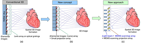 随着3D电视和显示技术的进步,三维立体显示逐渐成为大众关注的热点话题。作为一种真三维裸眼立体显示技术,立体全像(Integral Photography)能够在无辅助定位与显示装置的条件下显示全视差三维立体图像。但包括立体全像在内的现有裸眼三维显示技术其显示深度、分辨率和视角等受限于透镜阵列或光栅的性能,如何克服硬件条件,实现精准三维立体图像显示一直是立体影像领域亟待解决的问题。这项研究通过融合MEMS加工技术与信号通信及处理技术,摒弃裸眼三维立体成像中透镜或光栅引入的局限,开创MEMS光束扫描型真三维立体影像显示的先河。该研究着眼点极具独创性,同时得益于无光学畸变的高精度光束发射,该方法也在裸眼立体显示深度上获得重大突破,为实现超长距离裸眼立体显示寻找到有效途径。