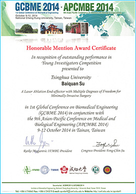 清华新闻网10月17日电 10月11日,在台湾成功大学举办的第一届全球生物医学工程会议暨第九届亚太地区医学生物工程学术会议(GCBME2014- APCMBE 2014)上,清华大学医学院生物医学工程系博士后苏柏泉博士发表的论文“A Laser Ablation End-Effector with Multiple Degrees of Freedom for Minimally Invasive Surgery”(用于微创手术的多自由度激光烧蚀末端操作器)获得Young Investigator Competition(青年组)论文荣誉奖(Honorable Mention Award)。