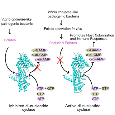 向烨研究组研究报道了霍乱核苷酸环化酶DncV及其与底物复合物的结构,基于结构阐明了DncV能合成三种不同环二核苷酸的分子机理。在DncV结构研究中,研究组同时意外发现一个类似叶酸的小分子结合在酶底物结合口袋的背面。这个经结构研究发现的小分子通过质谱分析后确定为5甲基四氢叶酸(5MTHF)或为带有两个谷氨酸的5甲基四氢叶酸(5MTHFGLU2),其中5MTHFGLU2占多数。参与5MTHFGLU2结合的蛋白残基在DncV类酶中高度保守。后续生化实验证实叶酸类小分子对DncV的酶活有抑制作用。同时细胞实验证实当细菌中叶酸合成途径被药物阻断后,环二核苷酸的合成量成倍增加。这些研究表明叶酸类分子有调节病原菌环二核苷酸类第二信使合成酶的生物活性。