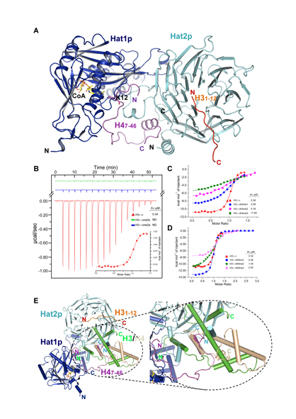 杨茂君教授实验室通过X-射线晶体衍射的方法解析了复合物Hat1p/Hat2p/H47-46复合物和Hat1p/Hat2p/H31-12/H47-46复合物的高分辨率晶体结构(图A)。该研究在分子水平上解释了Hat2p是通过促进Hat1p底物识别来提高Hat1p乙酰转移酶活性的机制;通过pull-down等生化手段验证了Hat1p与Hat2p之间相互作用的关键位点,并利用ITC对Hat2p与组蛋白H3相互作用的分子机制进行了进一步研究,发现了Hat2p可能通过识别不同修饰的H3来调节组蛋白修饰的分子机制(图B-D),这些发现对于研究Hat1p作为乙酰转移酶参与到DNA复制以及染色体组装等多种重要的生命过程都有着非常重要的指导意义。同时通过生物信息学对多种生物的Hat1进行比对后发现,Hat1p蛋白中与Hat2p相互作用的一段重要的区域并不在种间保守,更好地说明了Hat1p与Hat2p之间的相互作用的调节机制是从简单到复杂的一种进化过程,在高等生物的体内可能通过其它蛋白的参与对两者的相互作用进行调节。目前,已有研究证明组蛋白H3上122位的赖氨酸泛素化对新和成的组蛋白H3/H4二聚体的组装及转运具有重要作用。此外,通过结构比对作者发现H3/H4二聚体以一种全新的方式结合Hat1p/Hat2p(图E),该研究为阐明组蛋白修饰对染色体组装及组蛋白转运提供了一个全新的视点。