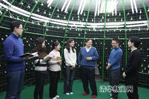 走进位于清华大学主楼7层一间普通的实验室,拉开帷幔,一个直径6米的大“笼子”映入眼帘。按下控制板上的开关,瞬时间,位于64个平面上的600多盏LED灯交替闪烁,光影错综,令人目眩。