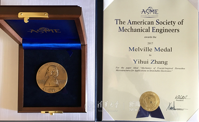 清华新闻网11月8日电 (通讯员 刘彬)11月6日,清华大学航天航空学院副教授张一慧和博士生马强合作的研究成果荣获2017年美国机械工程师协会(The American Society of Mechanical Engineers)最高论文奖梅尔维尔奖章(Melville Medal),美国机械工程师协会主席查拉·怀斯(Charla K. Wise)为获奖代表张一慧颁发了奖章。另外,国际工程科学协会(Society of Engineering Science)日前也将2018年“青年学者奖”授予张一慧,表彰他在力学引导确定性三维组装、分形柔性电子力学以及软质网状材料的仿生设计方面所做出的原创性工作。