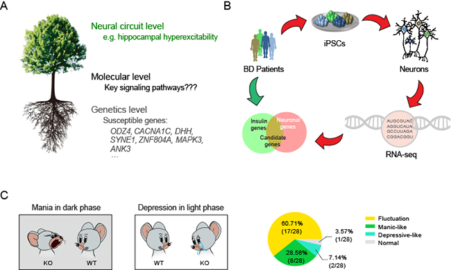 姚骏课题组在前期工作中,采用诱导多能干细胞技术对双相障碍病人的海马神经元进行了转录组和功能分析,发现了散发型病人尽管遗传缺陷各不相同,但是分子和细胞水平缺陷却高度一致的现象。因而,该类疾病的高遗传率可能在于某一条关键分子机制出现障碍并能够稳定遗传。基于这一分析,姚骏课题组提出解释双相障碍致病的树型机理假说(图一A),从三个层面推导了双相障碍发病的可能机理:1)在分子层面,某条给定的分子机制的缺陷是发病和遗传的枢纽;2)在神经环路层面,该分子通路缺陷在不同脑区和不同亚型神经细胞中起作用,综合形成高度复杂但又高度一致的双相行为表型;3)在遗传学层面,易感基因虽然各自功能不同,但最终都会通过某种方式影响该分子通路。基于这一模型,课题组将寻找假定关键的分子机制缺陷作为进一步研究的突破口。