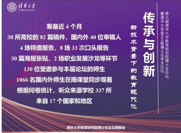 本届论坛是首届线上教研院博士生论坛,也是迄今规模最大的清华教研院博士生论坛。除了130位现场参与论坛的师生,还有1066名国内外师生在雨课堂同步观看此次论坛。他们来自国内外337所院校,位于17个不同国家和地区,共话“传承与创新:新技术背景下的教育现代化”。