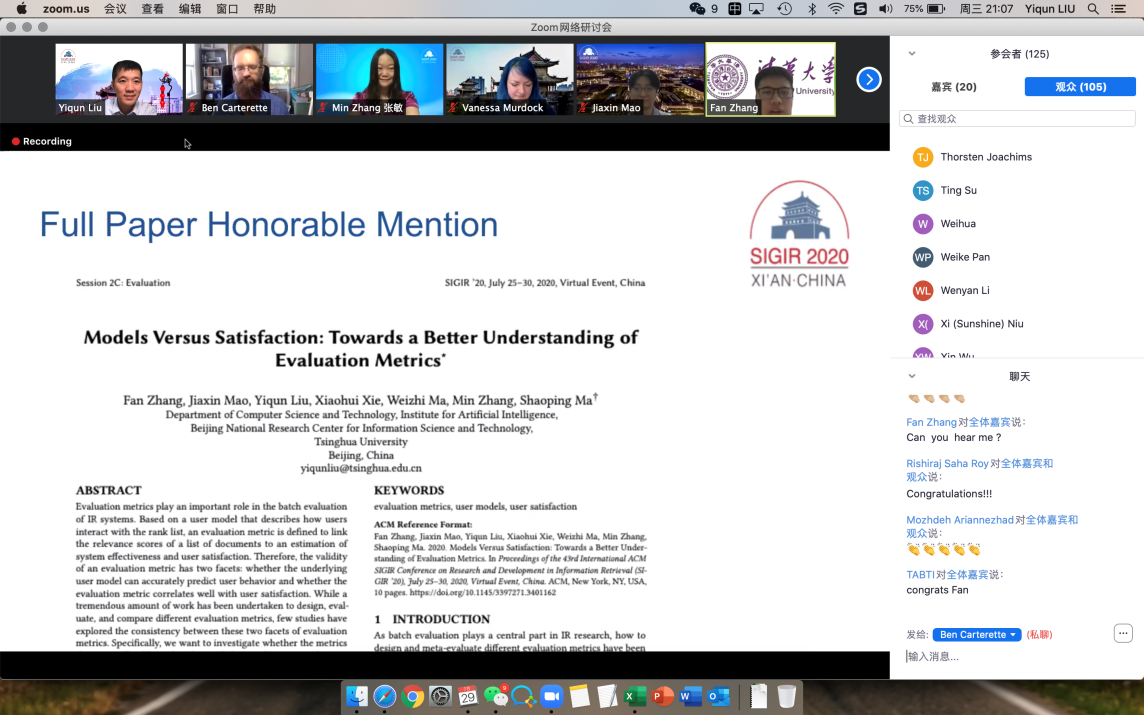 其中,计算机系博士生张帆(指导教师:刘奕群、张敏、马少平)为第一作者的论文《用户行为模拟与满意度预测:面向评价指标改进的尝试》(Models Versus Satisfaction: Towards a Better Understanding of Evaluation Metrics)获得大会唯一的最佳论文提名奖。该论文通过在一个公开数据集[2]和收集到数据集[3]上的实验,验证了基于用户模型评价指标在拟合用户行为和衡量用户满意度两方面的一致性,实验结果为现有的“基于用户行为日志拟合评价指标参数”这一方法论提供了经验依据。计算机系大三本科生于是(指导教师:刘知远)为第一作者的论文《基于小样本学习的对话式检索查询重写方法》(Few-Shot Generative Conversational Query Rewriting)获得大会唯一的最佳短文奖。该论文提出一种小样本学习方法,能有效捕捉对话上下文信息,提升对话式检索中的查询重写效果。电子系硕士生常健新(指导教师:金德鹏、李勇)为第一作者的论文《基于图卷积神经网络的物品组合推荐》(Bundle Recommendation with Graph Convolutional Networks)获得大会唯一的最佳短文提名奖。该论文提出了一个基于图卷积神经网络的物品组合推荐方法,解决了物品组合推荐面临的挑战以及现有工作的诸多局限性。