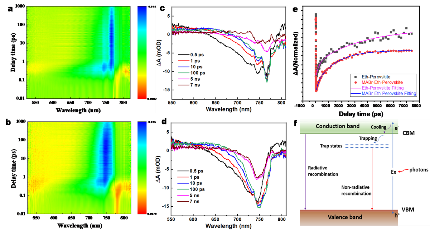 图3 钙钛矿薄膜飞秒瞬态吸收光谱和可能的激子捕获和复合过程