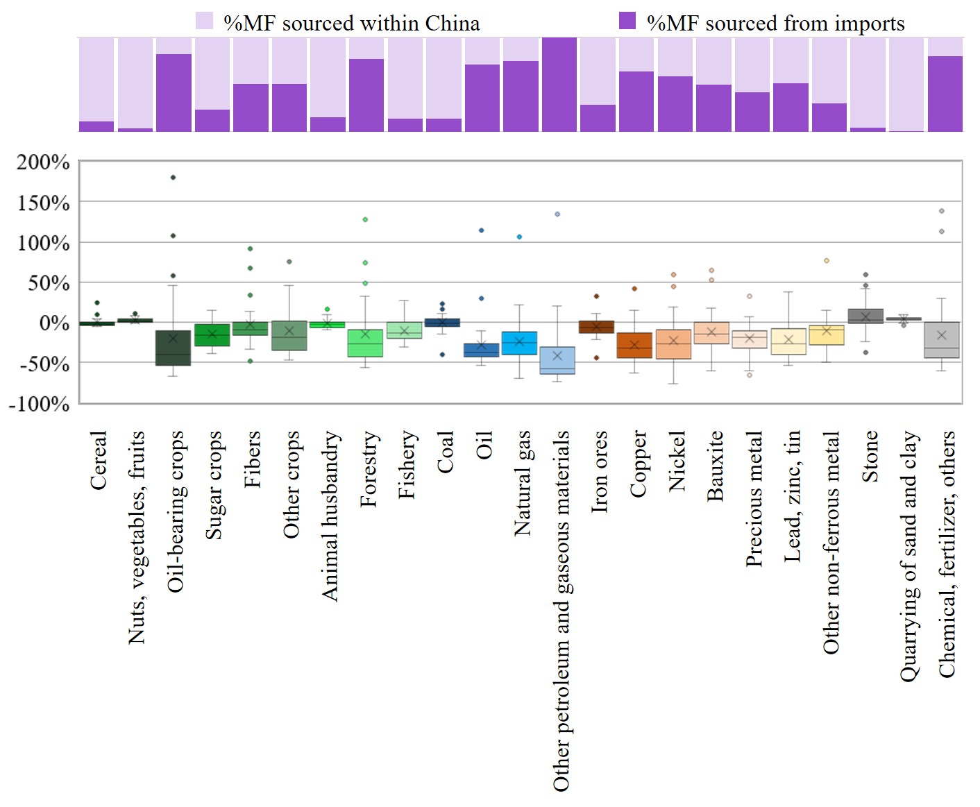 中国23类资源的物质足迹中进口所占的比重(上图);采用“等比例的区域贸易结构假设”方法与采用“区域贸易数据”方法核算的23类资源的分省物质足迹差异分布箱型图(下图)