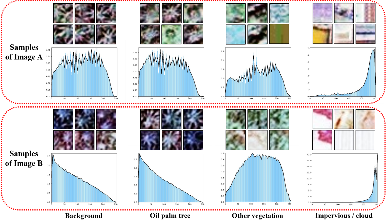 清华新闻网9月23日电 油棕作为一种重要的热带产油作物,具有很高的经济效益和生态研究价值。对油棕的准确识别有利于更好地油棕种植园管理,从而促进棕榈油产量的提高。基于遥感影像和深度学习模型,目前已有很多研究工作实现了高准确率的油棕识别。但是已有的工作主要聚焦于单一的、有限的研究区域。当使用不同传感器、不同时间、不同区域的复杂区域影像时,如果直接运用传统模型做预测,会因为遥感影像之间存在的明显差异,导致油棕检测结果精度出现大幅度的下降(如图1)。这时如果想要保持识别准确率,需要将新的影像样本加入到识别训练中,然而这将需要更多的人工标记成本。