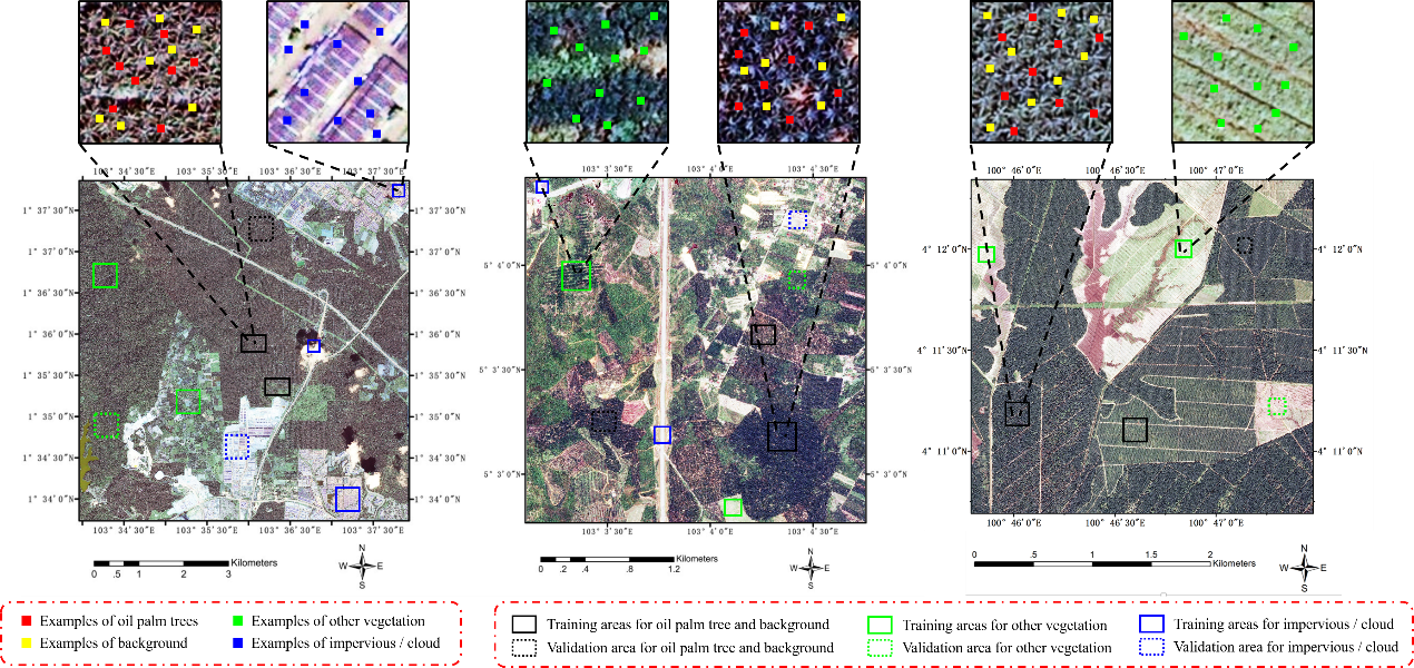 为了进一步将油棕识别应用于更大规模区域,付昊桓研究组提出了一种新的领域自适应模型(Multi-level Attention Domain Adaptation Network, MADAN)。该方法不需要重新标注目标域的样本,只需要源域的样本和目标域的影像信息即可。MADAN采用了基于对抗学习的多层次注意力机制,有效地度量了不同影像以及同一影像不同区域的迁移能力,同时极大改善了目标域中容易混淆的样本预测的置信度。研究组成员以马来西亚三个不同区域及其遥感影像为例(如图2),发现MADAN与现有最新的方法相比,精度上实现了3.55~14.49%的显著提升。