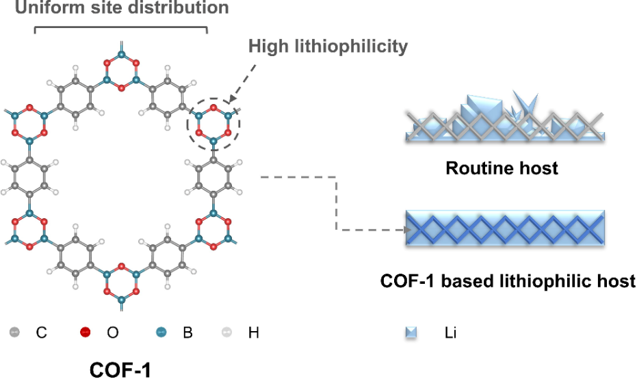在此基础上,为了在锂金属电池中消除扩散控制的不利影响,张强团队通过引入亲锂负极骨架以降低锂离子的界面扩散能垒,并最终抑制锂枝晶的生长。为此,精确构造具有预定化学结构和有序几何分布的亲锂位点是材料设计的关键。张强团队提出了一种构造锂金属负极亲锂骨架的新方法,使用了一种环硼氧烷结构的共价有机骨架COF-1,以构筑长程有序的亲锂骨架。该方法首次利用共价有机骨架材料,在原子尺度上精准地构筑了亲锂位点,从而实现了稳定循环的锂金属电池,为锂金属电池的实用化发展提供了新的思路。