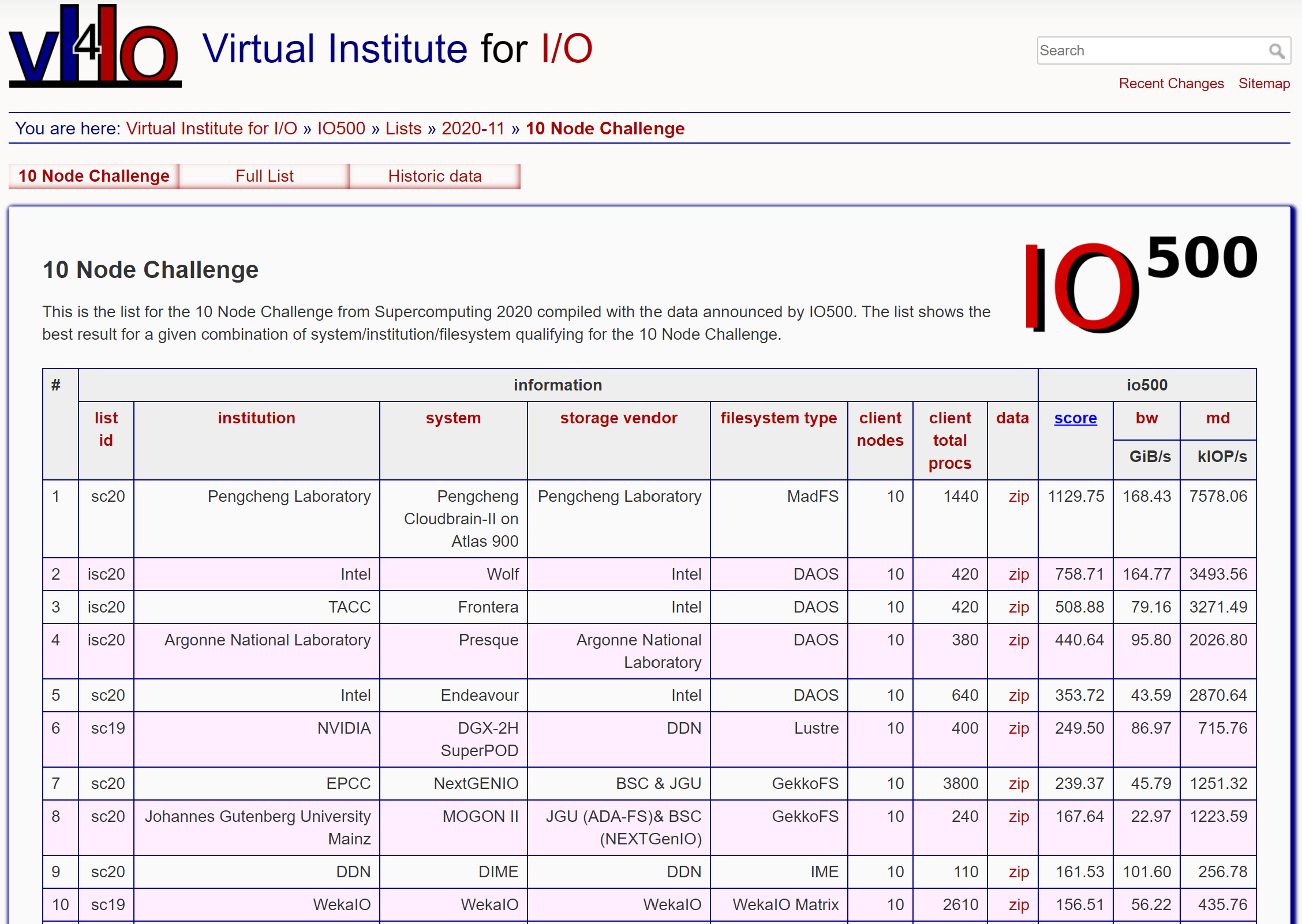 IO500全系统榜单前十