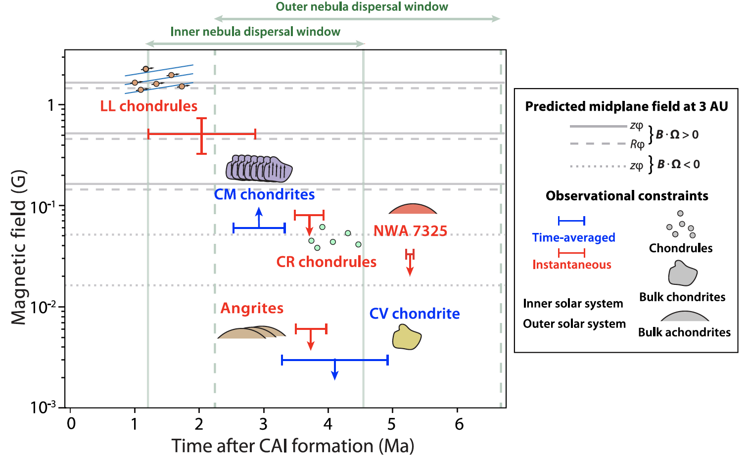 图2.陨石中记录到的太阳星云磁场随时间的演化图,显示出磁场逐渐减弱,而太阳星云在形成300-400万年后消散