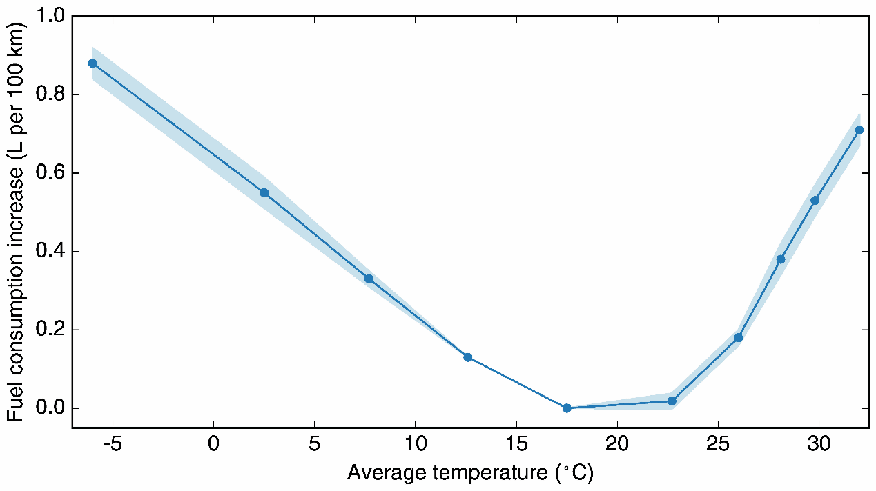 图1 轻型乘用车燃油消耗随平均气温的变化(以15-20℃为基准)