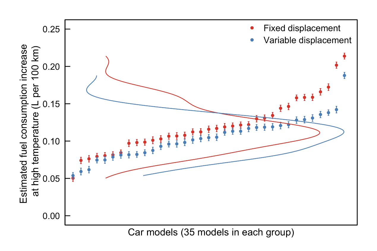 研究进一步识别了不同车型在高温条件下油耗增加幅度的差异性,反映出不同车型和不同空调技术(如采用定排和变排压缩机)的实际能效存在差异。例如,日系品牌的车型平均油耗增加为0.09升/百公里,而自主品牌的车型油耗则平均上升0.13升/百公里。安装定排压缩机的空调车型油耗上升明显高于安装变排压缩机的空调车型(见图2)。通过耦合面板回归模型和随机前沿模型分析,研究发现如果中国实施更有针对性的燃油经济性法规(如包含车用空调的能效测试)或制定更高的车用空调能效标准,可以在不增加车主经济负担条件下,每年实现约160至240万吨CO2减排量。