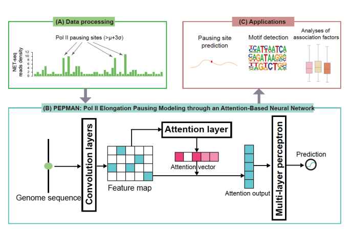 真核生物的转录是一个高度复杂且被准确调控的动态过程,RNA聚合酶II(RNA polymerase II, Pol II)作为转录过程(特别是转录延伸阶段)的核心分子成员,对遗传信息的传递起着关键作用。研究表明,在转录延伸过程中,普遍存在Pol II暂停(Pol II pausing)现象,其参与下游基因的表达调控、影响基因可变剪切的发生,与细胞分化、发育等生命活动息息相关。目前,Pol II暂停相关的转录调控机制研究主要依赖于NET-seq(Native elongating transcript sequencing)等高通量测序技术,成本高、需要一定实验周期。因此,如何实现在全基因组水平上快速、高效的分析Pol II暂停的偏好位点及其序列特征,以及其与相关转录因子间的关系,是转录调控领域亟待解决的技术难点。为了解决这一问题,来自清华大学的曾坚阳、赵诞团队采用基于注意力机制(attention mechanism)的卷积神经网络对全基因组上的Pol II暂停位点进行预测。在NET-seq数据集上,其预测准确率均显著优于现有机器学习模型。此外,研究组通过分析模型的注意力机制以及分析模型在基因组上特定位点的预测值,进一步探索了Pol II暂停的生物学特征以及和其他转录调控机制的关系,包括:发现了决定Pol II暂停的序列特征以及其与暂停位点的关系;通过分析不同可变剪切方式位点上Pol II的暂停倾向,提供了Pol II影响可变剪切的可能生物学机制;全面分析了Pol II与转录因子、组蛋白修饰、DNA甲基化发生的相关性;发现模型能够很好的弥补测序数据深度不足带来的缺陷。