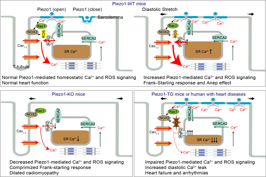 心肌细胞特异性敲除或过表达Piezo1导致钙信号和ROS信号失调以及心脏功能障碍,证明了Piezo1可以维持心脏功能稳态。当心肌细胞受到机械力刺激,Piezo1开放引起的钙内流一方面增加肌浆网钙库的含量,并通过NOX2-ROS信号通路增强RyR2的通道活性,可导致心肌细胞在收缩期的钙反应增强从而增加心肌细胞的收缩强度,从而维持心脏正常功能稳态。敲除Piezo1导致钙内流和ROS产生的减少,从而导致肌浆网钙含量降低以及RyR2通道的敏感性降低,阻断了正反馈回路,引起心脏泵血功能下降,导致扩张型心肌病;而过表达Piezo1则引起钙内流和ROS过度产生,引起自发性肌浆网钙泄漏增加,致使肌浆网钙库大量损失,并产生可致心律失常的钙波,最终导致Piezo1过表达小鼠出现严重的心力衰竭和心律失常表型。