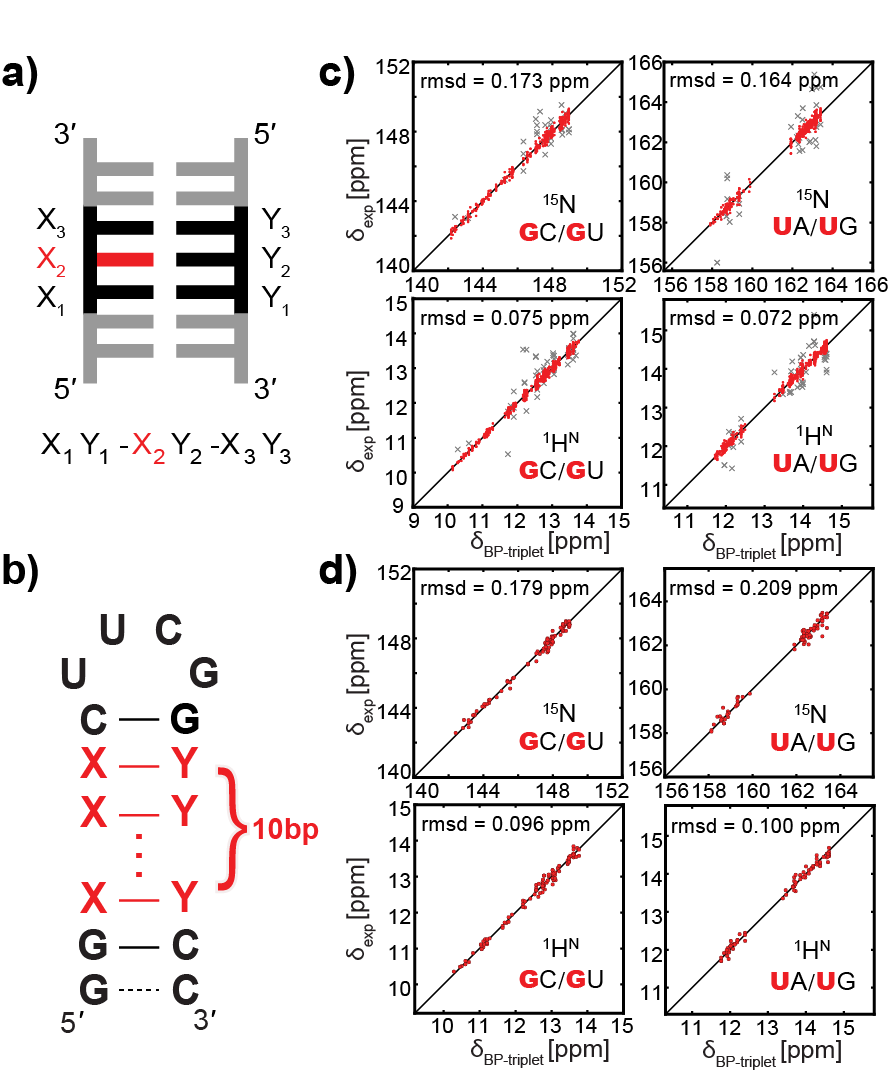 a) “碱基对三联体”的定义;b) 发卡RNA的二级结构;c) 化学位移预测值与实验值的相关性(训练集);d) 化学位移预测值与实验值的相关性(测试集)