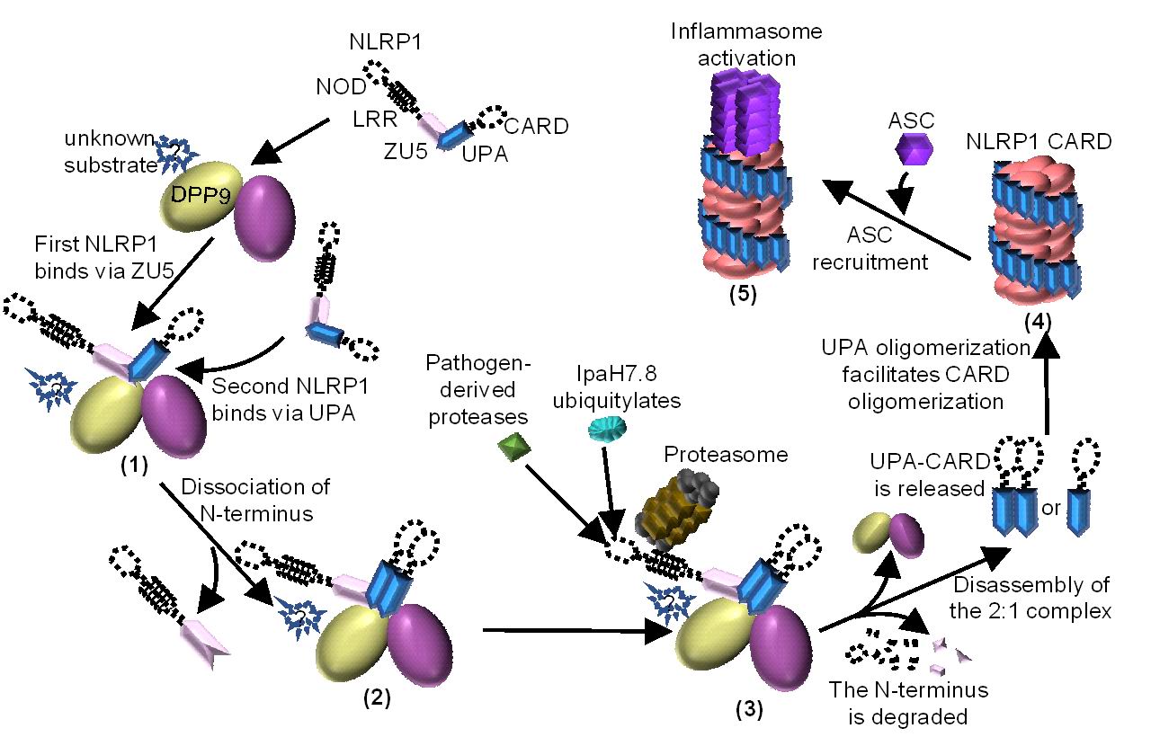 图2. DPP9介导的NLRP1抑制机制以及病原体诱导的NLRP1活化机制模式图