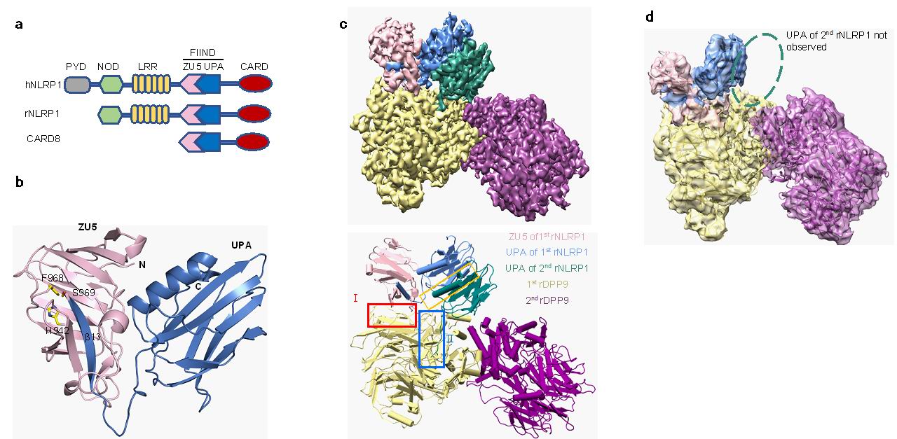 图1. NLRP1 FIIND结构域结构以及全长NLRP1-DPP9 2:1复合体结构