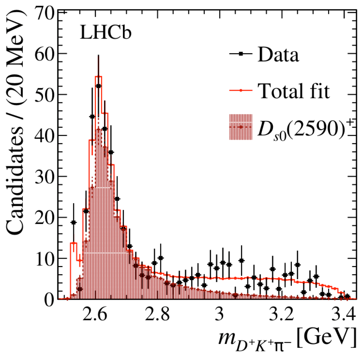 利用了LHCb实验在2016-2018年采集的质子-质子对撞数据,陈晨与LHCb清华团队一起研究了底介子的一个四体衰变过程,衰变末态包括正反粲介子对(D+D-)、一个奇异介子(K+)和一个派介子(pi-)。在分析三体系统(D+K+pi-)的不变质量谱中时,意外地观测到一个全新的共振结构。进一步的研究测量了这个共振结构的基本性质,结果表明它与奇异粲介子主量子数为2的径向激发态相符。由于这个新粒子的质量大约为2590 MeV(近乎质子质量的三倍),带一个单位的正电荷,并且自旋为零,所以被命名为Ds0(2590)+。粲介子家族喜添新丁。