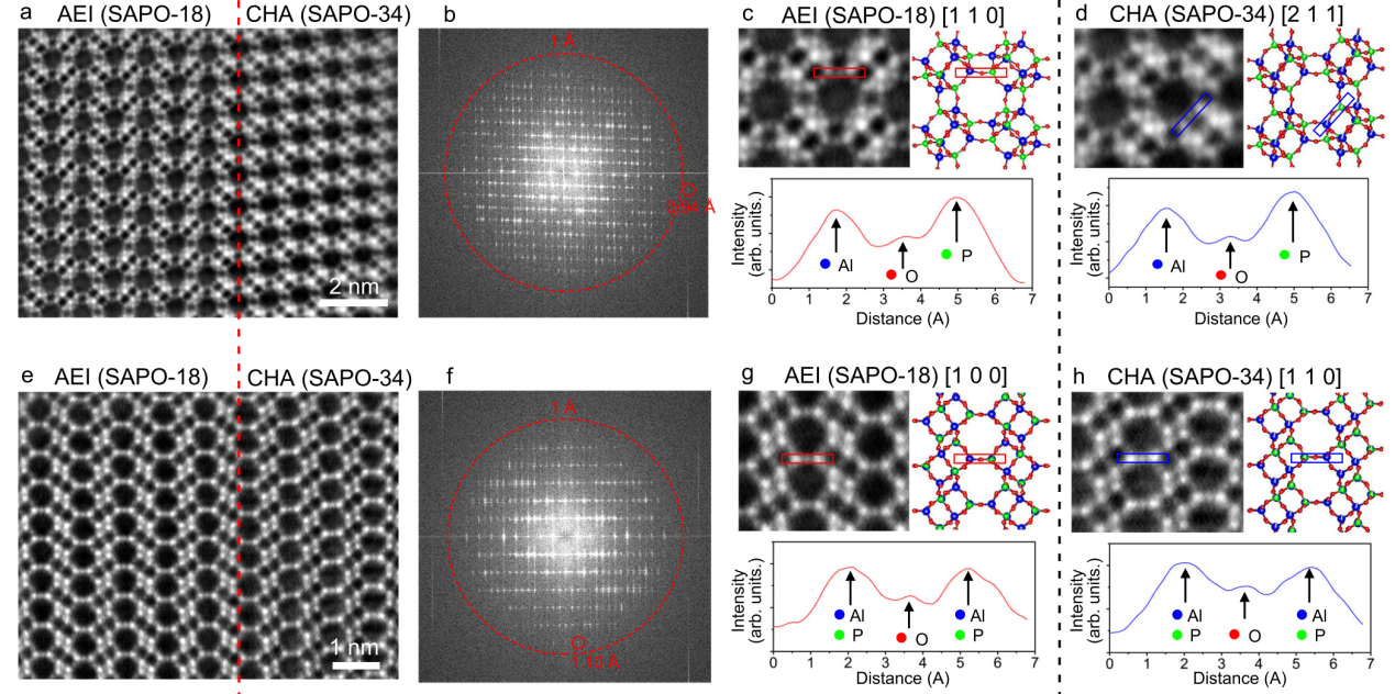 清华新闻网4月14日电 以沸石分子筛为代表的无机多孔材料由于其可调控的结构,在催化、能量转换、气体储存和分离等领域有着广泛的应用。多孔骨架材料结构调变研究的进展使我们能够通过改变孔隙率、连通表面和缺陷来设计各种多孔骨架结构。这样的多样性使得多孔材料的世界丰富而精彩。例如,两种磷酸硅铝分子筛SAPO-34和SAPO-18在一个方向上完全匹配,通常形成交生结构。在SAPO-34/18交生晶体中,SAPO-34和SAPO-18相区的空间分布和堆积顺序决定了两种骨架组装过程中微观结构的多样性,进而影响交生晶体的宏观结构以及催化性能。可控的结构设计首先需要拥有超高水平的实空间成像能力(分辨率和信噪比)来获取更多的结构信息。我们可以通过解析多孔材料的局部结构来更好地理解多孔材料的结构-性能关系,进而指导研究者按照目标功能来设计多孔材料的结构。然而,分子筛等电子束敏感材料的原子级表征对于电子显微镜仍然是一个重大挑战。
