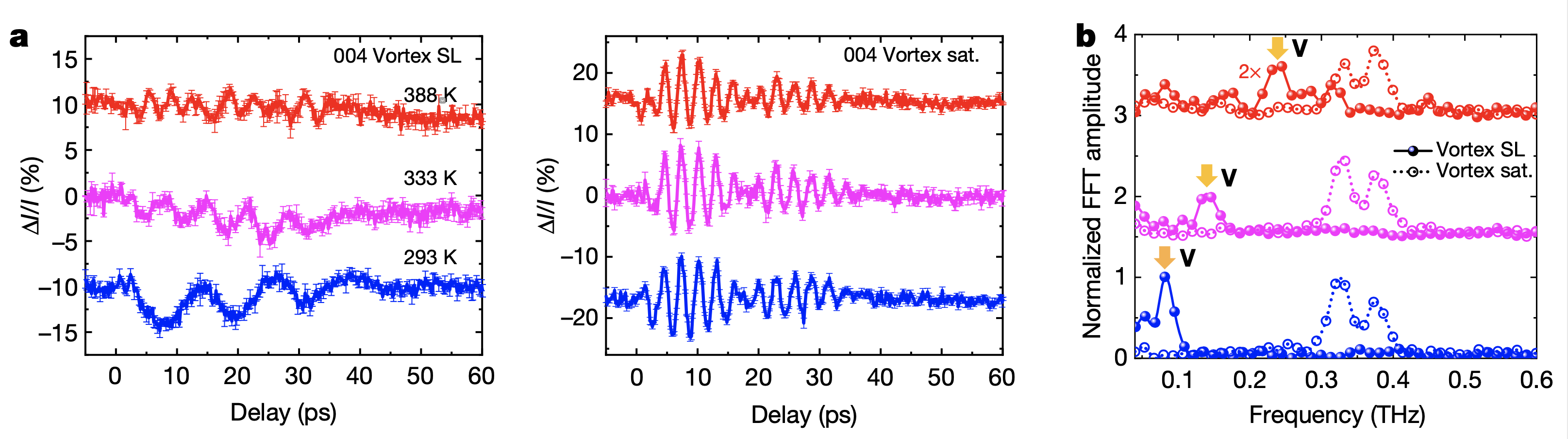 实验中(a)293 K下0.08 THz模式(b)0.3-0.4 THz模式及(c)二者对应频谱的温度演化