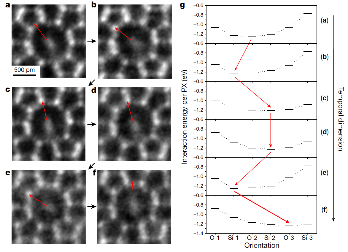 在本文中,魏飞教授团队利用对二甲苯(PX)分子作为ZSM-5分子筛孔道内的指针分子来探测每一个孔道内的范德华相互作用。PX分子中的两个甲基使得苯环在孔道中立起来,苯环平面形成可以自由旋转且有明确取向的指针。类比罗盘的指针,PX单分子指针的取向能够反映出孔道内部的范德华相互作用。利用积分差分相位衬度扫描透射电子显微技术(iDPC-STEM)实现了对准二维ZSM-5片层(4-6纳米厚度)和孔道内部单个PX分子的直接成像。这一技术的核心是iDPC-STEM可以实现低电子剂量下小有机分子高精度成像,结合化学蚀刻技术制备表面原子级平整且取向清晰的准二维ZSM-5片层并填充单个PX分子,使ZSM-5分子筛骨架可以被原子级解析,而PX分子内苯环的取向也可以被清晰地显示。实验发现,在不同孔道中PX分子的取向不同,并且与孔道的几何形状直接相关,如图1所示。通过图像和计算的对比,证实了不同的PX分子取向是由孔道几何形状变化造成的,因此分子取向的成像能够反映孔道内范德华相互作用的变化。同时,还在连续的图像拍摄中观察到了分子取向随时间的变化,变化规律与孔道几何形状随时间的变化相一致,如图2所示。该方法不仅能够给出主客体范德华相互作用在二维ZSM-5平面的空间分布,也可以给出这种相互作用在单个孔道内的实时变化。