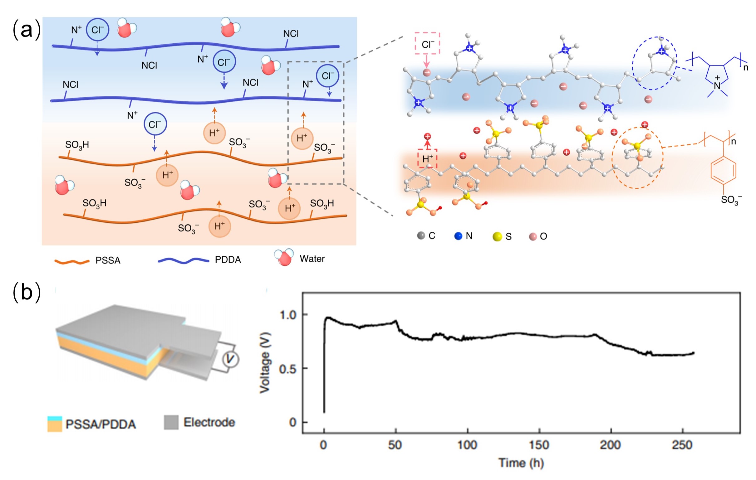 本研究采用双层聚电解质膜(BPF)作为发电材料,构筑了一种异质的湿气发电器件(HMEG)。HMEG能够自发吸收环境空气中的水汽,形成带电的可迁移离子(H+和Cl-)的异质分布和定向扩散,在相对低湿度25% RH(25oC)的大气环境下可以长时间产生0.95V的电压,在85%RH下电压可达1.38V。