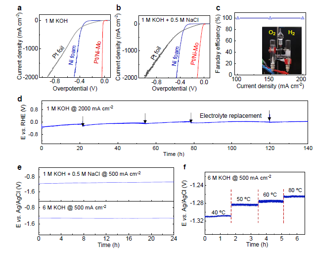 解决在工业条件下或在低品质水中的催化剂寿命问题,对于电解水制氢的实际应用有重要意义。因此,该研究进一步探究了Pt/Ni-Mo催化剂在模拟海水和工业条件下的高活性和长时间的稳定性。该催化剂不仅在碱性溶液下能稳定运行超过140小时,在盐水(1M KOH+0.5 M NaCl)中仅需113mV的过电势就可达到2000 mA cm-2的电流密度,并稳定运行超过24小时。同时,能够在80摄氏度的温度下的强碱溶液(6M KOH)中实现长时间的稳定性。