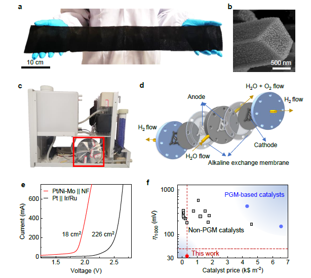 该研究还探索了催化剂的大面积合成,可以实现700cm²的大面积制备。并替换制氢机膜电极中的商用催化剂,实现了性能的超越,从而证明了该催化剂具有巨大的应用潜力。