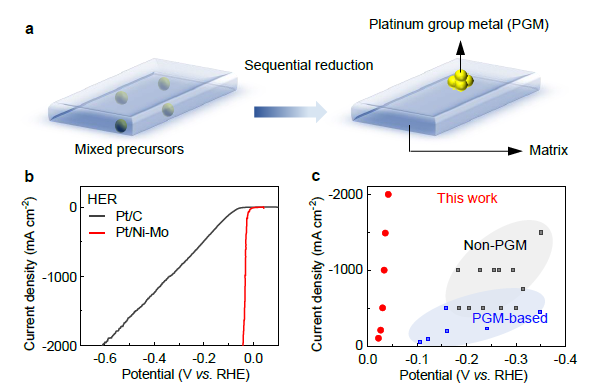 近日,清华-伯克利深圳学院刘碧录团队与中国科学院上海高等研究院李炯团队合作,通过两步法制备出Pt纳米颗粒高分散在高比表面积的Mo-Ni基底上的析氢催化剂(Pt/Ni-Mo),仅需42mV和113mV的过电势,即可分别在1M KOH和盐水(1M KOH+0.5 M NaCl)中达到2000 mA cm-2的电流密度,并能够实现大面积生长和膜电极应用,为电解水制氢技术的理论研究和实际应用提供了帮助。