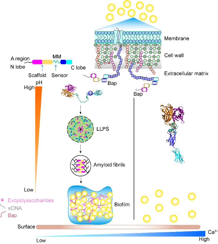 清华新闻网6月3日电 近年来,由多重耐药性金黄色葡萄球菌引起的院内感染已对全人类的健康构成极大威胁。全球每年有近100万人死于无法用传统抗生素治疗的细菌感染,其中,耐甲氧西林金黄色葡萄球菌造成的死亡病例远超过由艾滋病和肺结核引起的死亡病例总和。金黄色葡萄球菌的耐药性往往与其能形成生物被膜密切相关。人们很早就在奶牛源金黄色葡萄球菌中发现一种被称作生物被膜相关蛋白(Biofilm associated proteins)的细胞表面蛋白Bap,Bap在介导葡萄球菌生物被膜的形成中发挥重要作用。Bap是一个多结构域蛋白,全长蛋白含有2276个氨基酸。最近的研究表明,Bap蛋白的N末端在低pH和低钙下易于聚集形成功能性淀粉样纤维,并且促进细菌聚集和生物被膜的形成。然而,Bap蛋白响应环境变化调控淀粉样纤维的形成以及介导生物被膜形成的机制并不清楚。