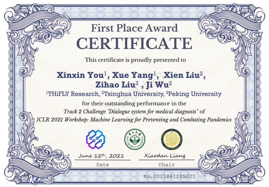 清华新闻网6月21日电 国际表征学习会议(ICLR,International Conference on Learning Representations)是机器学习领域最负盛名的三大顶级国际会议之一。为了推动机器学习技术在医疗健康领域的发展,国际表征学习会议2021发起了机器学习预防和防止流行病(MLPCP,Machine Learning for Preventing and Combating Pandemics)全球挑战赛。电子系吴及教授课题组参加了机器学习预防和防止流行病挑战赛的疾病自动诊断对话系统(Dialogue system for medical diagnosis)赛道,在全球73支参赛队伍中夺得第一名。参赛成员主要为实验室工程师尤心心、实习生杨雪、博士生刘喜恩和吴及教授。