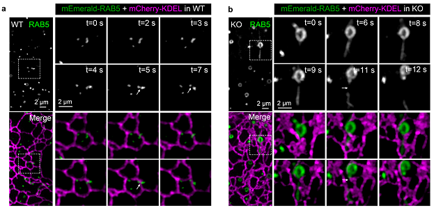 图1.与野生型的COS7细胞(a)相比,SEC14L2敲除的细胞(b)表现为内吞体分裂延迟及体积增大。