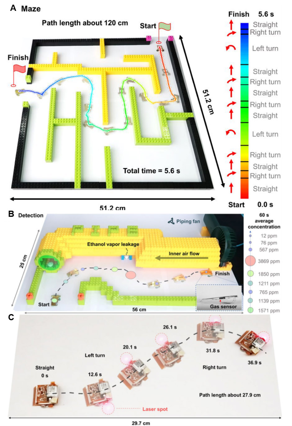 图A:拖缆机器人在5.6秒内通过1.2m长的迷宫轨道;图B:拖缆机器人携带气体传感器记录VOC浓度分布;图C:无缆机器人行走“S”形轨迹。