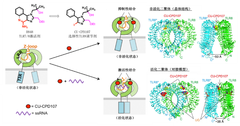 图2 TLR8的全新小分子CU-CPD107作用机制模式图